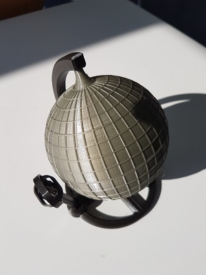 Ein 3D-gedruckter Globus, in dem innen ein Magnet eingefügt ist, zusammen mit einer Magnetfeldsonde demonstriert, wie das Magnetfeld rund um die Erde orientiert ist und zeigt die unterschiedliche Inklination je nach Breitengrad.